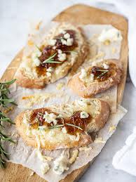 3. In a bowl mix together the blue cheese and honey until smooth and soft. Spread the mixture on each crostini and top with fig slices.