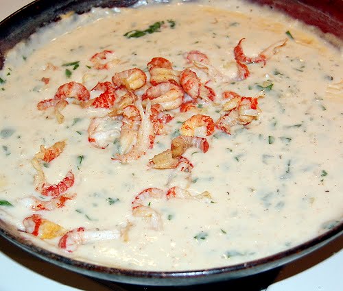 Heat 3 Tbsp butter in saute pan. Add onion and cook until translucent over medium heat. Stir in flour and cook 2 minutes stirring often. Whisk in clam juice and add cream, cayenne, salt and pepper. Cook 2-3 minutes. Remove from heat and set aside. Heat 3 T butter in another pan. Add shrimp and scallops and saute about 2 minutes. Finally, add crabmeat and saute 30 seconds.