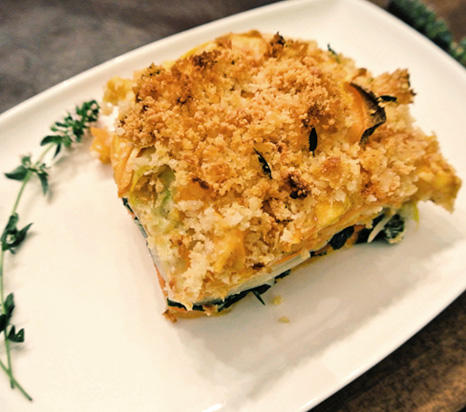 Heat a large sauté pan to medium heat. Add 1 tbsp butter. When butter is melted and begins to foam, add the shallot and sweat. Add 1 minced garlic clove and cook until fragrant (about 20-30 seconds). Add the kale and reduce heat to medium-low. Cover and cook kale until wilted, tossing occasionally. Season with salt and white pepper and set aside. While the kale is cooking, prepare the cream. Pour the cream into a small saucepan and set to medium heat. Cut a slit into the ½ piece of onion and stick in a bay leaf. Poke the cloves into the onion and submerge in the cream along with 1 sprig of thyme. Right when steam begins to come off of the cream, remove from heat, remove onion with spices and herbs and set aside. Preheat oven to 400ºF. Butter an 11 x 7–inch glass baking dish and add a spoonful of the flavoured cream mixture. Add 1 layer of sweet and Yukon gold potatoes, making sure to slightly overlap the slices. Season lightly with salt and white pepper, and drizzle in some of the cream. Top with a light layer of Gruyère and Parmesan. Repeat process of layering in different slices of vegetables (a different vegetable on each layer), seasoning, and adding cream and cheese until vegetables reach the middle of the baking dish. Add the kale mixture to make the middle layer of the casserole, and repeat the vegetable and cream layering and seasoning process on top until vegetables reach the top of the baking dish. Melt the remaining butter in a small bowl. Add in the remaining minced clove of garlic, the leaves from the remaining thyme sprigs, and panko breadcrumbs. Toss to coat. Sprinkle on top of the layered vegetables along with any remaining cheese. Bake for about 60 minutes or until tender when pierced with a knife. Serve immediately. Tip: Slice carrots and potatoes in advance to cut down on prep time!