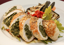 Preheat the oven to 325 degrees. Sauté the chopped mushrooms in the vegetable oil. Drain the mushroom liquid, return to heat and add the spinach, minced shallots and thyme leaves. Sauté the vegetables for an additional 3 minutes. Add ½ teaspoons of kosher salt, cooked crumbled bacon, blue cheese, drained cottage cheese and bread crumbs to the vegetable mixture. Stir to mix thoroughly. Pound the chicken breasts to ¼-inches thick between two pieces of waxed paper. Spoon ¼ of the spinach cheese onto each breast and roll each up. Rub the outside of chicken with olive oil and sprinkle with additional kosher salt and the ground black pepper. Bake the chicken on a baking rack at 325 degrees for approximately 30 minutes to 45 minutes or until internal temperature reaches 160 degrees.