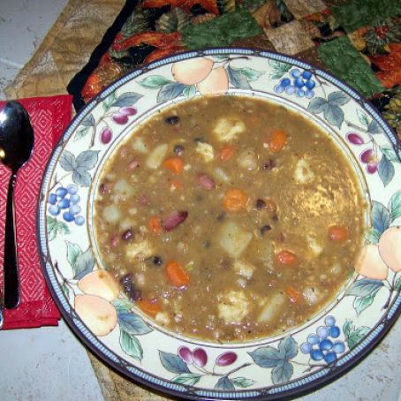 Whole Foods Market sells in bulk a 7 bean and barley mix. If you do not have access to this store, you could buy a pound bag of 17 bean soup and add 1/4 cup pearl barley, 1/4 cup yellow or green split peas, and 1/2 cup lentils.