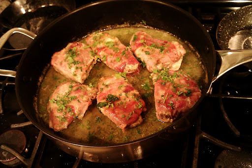 Sear the chicken on both sides and remove. Make sauce and return chicken; simmer. Top with sage, prosciutto, cheese and parsley.