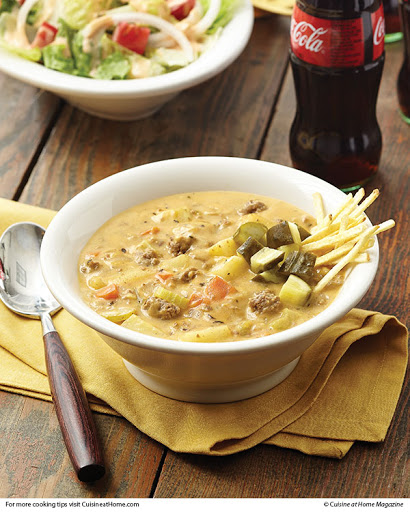 Stir in Cheddar, ketchup, and mustard until cheese melts; season with salt and pepper. Garnish soup with pickles and serve with shoestring fries (see tip).