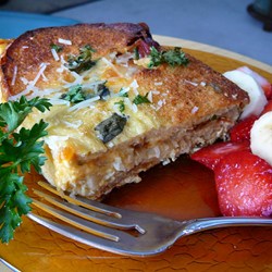 In a medium bowl, whisk together the eggs, milk, parsley, and pepper. Pour the egg mixture over the bagel layers. Cover, and refrigerate 8 hours or overnight.