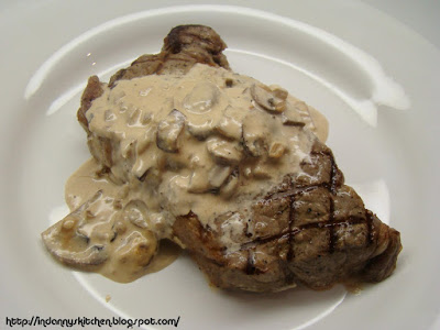 In a hot Frying pan saute Mushrooms and onion until soft approx. 5 minutes, then add brandy.