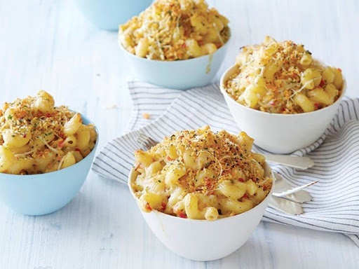 To complete the dish, melt a couple of tablespoons butter in a small skillet, over low heat and add 3 tablespoons hot sauce. Warm through, then add the panko crumbs and toss to evenly coat the crumbs in sauce mixture. Cool the crumbs, then toss in the parsley and 1/2 cup grated Parmigiano -Reggiano cheese. Top the mac n cheese with the spicy crumb mixture. Arrange individual crocks on a baking sheet or put the casserole on baking sheet to catch any drips. Bake until brown and heated through, about 10 minutes. If cooking from cold, the mac n cheese will take 40 to 45 minutes, but add the crumbs the last 10 minutes of baking.