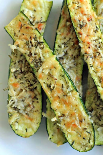 Pre-heat oven to 350F, lightly brush both sizes of the zucchini with olive oil and place on a foil-lined baking sheet. Mix cheese and herbs together in a small bowl and sprinkle over the zucchini along with salt and pepper to taste. Bake for 15 minutes and place under the broiler for the last 3-5 minutes until cheese is crispy and browned.