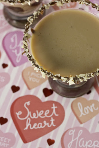 Rim martini glasses with chocolate syrup and chopped almonds. Drizzle martini glass with both chocolate and caramel syrup.