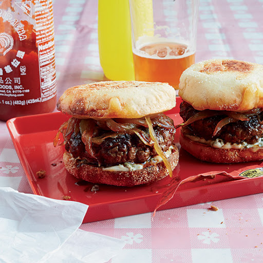 Golden Onion Cheeseburgers with Caper Mayonnaise