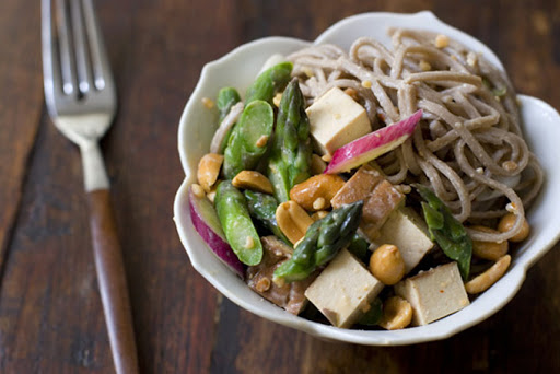 Bring a large pot of water to a boil. Boil the soba noodles per package instructions. In the last minute or so of cooking toss in the asparagus. Drain noodles and asparagus, run under cold water for about a minute to stop cooking, and set aside.