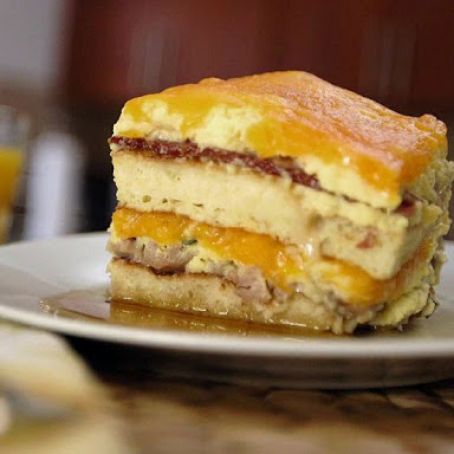 To assemble: Butter a casserole dish, and line the bottom with a single layer of pancakes. Lightly spread the bechamel over the pancakes until covered. Place the chopped sausage on top of the pancakes, spreading evenly until covered. Spoon half the egg mixture over the sausage and spread until evenly dispersed. Add another layer of the bechamel, and then add a layer of shredded cheese. Add another layer of pancakes, then bechamel, then bacon strips, bechamel again, then eggs and finish with a liberal covering of cheese. Bake until the cheese has melted on top and begun to get crispy, about 10 minutes. Remove from the oven and let cool. Then cut portions of lasagna.