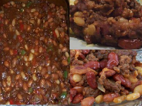 Cook cut bacon, drain on paper towel, drain most of the fat add ½ cup water and brown beef. Mix all beans, tomato soup, brown sugar, mustard and onion soup mix; add bacon and browned beef. Place in 9×13 baking dish and bake 350 degrees F for 1 ½ hours or until desired consistency.