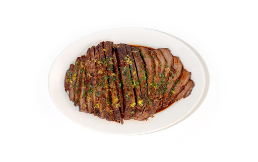 Discard fat from surface of braising liquid. Transfer brisket to a cutting board and thinly slice against the grain. Return brisket to roasting pan. Set pan over 2 burners at medium heat. Cover; simmer until heated through. Transfer brisket to a platter. Sprinkle parsley and lemon zest over. Pour pan juices into a pitcher and serve alongside.