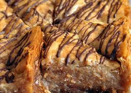 3. Brush cookie sheet with butter, layer 8 phyllo sheets, brushing each with butter. Layer 2 cups nut mixture. Layer 4 more phyllo sheets, buttering each. Layer nuts and phyllo several times until nut mixture is gone, and end with phyllo. Drizzle with remaining butter.