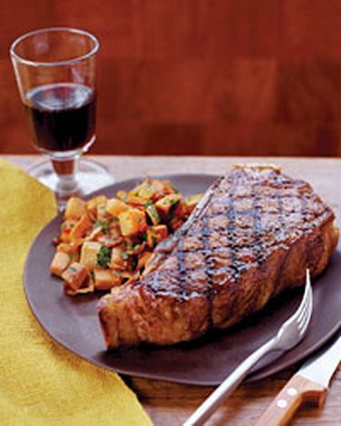Chef Frank Stitt of Highlands Bar & Grill in Birmingham, Alabama, notices a marked difference between strip steaks cooked with the bone and those cooked without it: "There is this added flavor that the bone lends to the beef, and it keeps the meat around the bone especially tender," he says. Stitt pairs these steaks with smoky sweet potato hash browns: "Sweet potatoes have so much personality for such an inexpensive, humble ingredient."