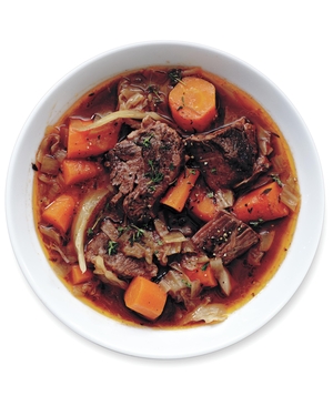 Pour the wine into the skillet and scrape up any browned bits; add to the cooker. Stir in the potatoes, carrots, broth, salt, thyme, and bay leaf.
