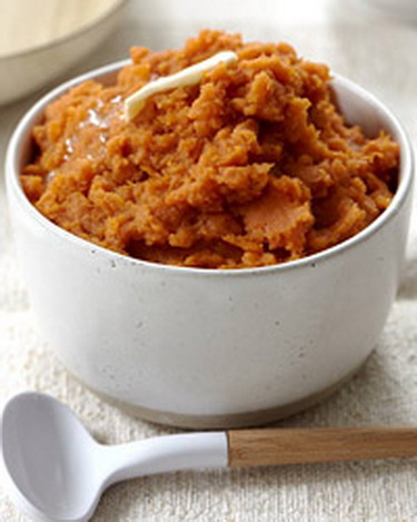 Peel the sweet potatoes and transfer to a large bowl. Mash with a potato masher until creamy, then mash in the butter and apple butter. Season with salt and serve.