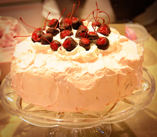 To assemble: Spread 1 cup buttercream on bottom cake layer. Repeat with 1 cup more buttercream and second cake layer. Top with final cake layer and frost top and sides with pink whipped cream frosting. If using two 9-inch layers, cut each layer in half and divide the buttercream evenly among the 4 layers. Decorate with whipped cream and cherries. Refrigerate until serving or serve immediately.