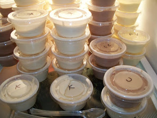You can get 2 oz plastic cups with lids at GFS or other restaurant supply stores. I know GFS has mini spoons, too. The lids are key because then you can stack the shots in your freezer.
