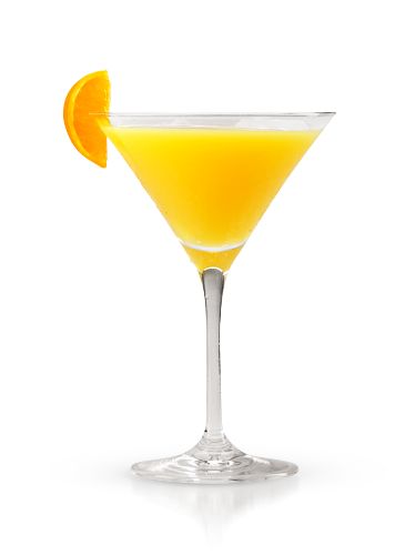 Shake peach vodka, orange juice and pineapple juice with ice in a cocktail shaker.