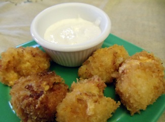 Then take 3 bowls out and put the flour in one bowl, buttermilk in another and then Panko breadcrumbs in the third. Take each ball and roll them in the contents of the bowls - in that same order; set them aside. While doing this you can heat a pot of oil for frying.