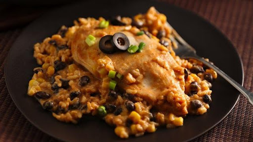 Return chicken to skillet. Reduce heat; cover and simmer 20 to 25 minutes or until liquid is absorbed, rice is tender and juice of chicken is clear when center of thickest part is cut (at least 165°F). Sprinkle with olives and green onions.