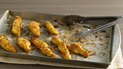Mix Bisquick mix, cheese, salt and paprika in 1-gallon resealable plastic food-storage bag. Dip half the chicken strips into egg; place in bag of Bisquick mixture. Seal bag; shake to coat. Place chicken on cookie sheet. Repeat with remaining chicken. Drizzle butter over chicken.