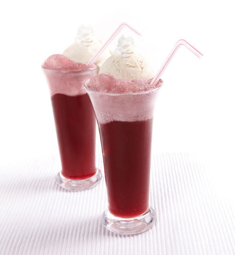 Fill blender with 2 tablespoons of blackberry puree, 1 tablespoon lime juice, the apple juice, and a handful of ice. Pulse 5 to 6 times until the drink is ice cold. Strain the mixture into a pitcher. Return to blender and add 1/2 the ice cream. Pour into 4 glasses, so that each has the same amount. Top with 6 ounces of ginger ale and stir lightly. Repeat for the remaining 3 servings, topping off each glass with a scoop of the remaining ice cream.
