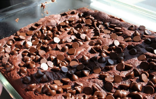 Preheat oven to 350 degrees. Mix your pudding with the milk. After mixing your pudding and milk, stir in your chocolate cake mix. Just the dry mix, do not add anything to it. The batter will be very thick. (Like very thick frosting!). Spread it into a greased 9x13 baking pan and scatter the chocolate chips on top. Bake for 25-30 minutes, until the edges start pulling away from the pan.