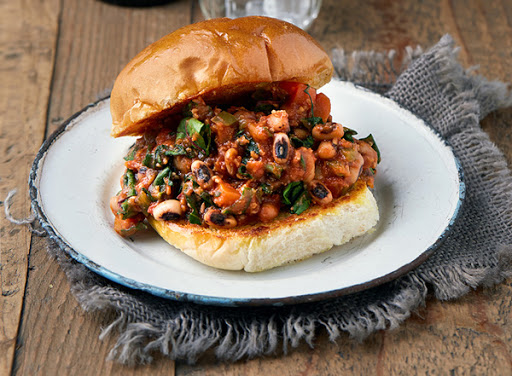 Thirty minutes before serving: Add the greens and tomato paste. Add the salt and pepper right before serving and more Cajun seasoning if needed. Serve open-faced style with the black-eyed pea mixture ladled over a lightly toasted bun.