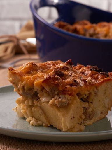 Refrigerate for at least 6 hours, or overnight. Preheat the oven to 350°F. Top the strata with the remaining cheese and bake for 1-1/2 hours.