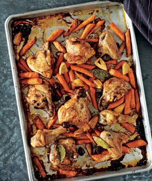 1. Heat oven to 425° F. On a large rimmed baking sheet, toss the chicken, carrots, olives, bay leaves, lemon, oil, 1 teaspoon salt, and ¼ teaspoon pepper. Arrange in a single layer and sprinkle the chicken with the paprika.