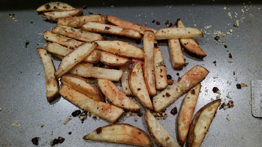 Cut potato into 1/4" thick slices, then turn and cut into 1/4" thick strips. Place in bowl and toss with oil and garlic (use hands to evenly coat). Season with salt & pepper. Place in SINGLE LAYER on baking sheet.