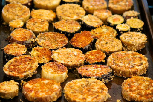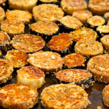 3.Cut the eggplants into thick rounds. (I like them to be between 1/2 and 3/4 inches thick so they have time to brown in the oven before they become too soft.) Dip the eggplant slices in the egg mixture, letting the excess drip off. Dredge the dipped slices in the Parmesan mixture, pushing down gently to coat well. Transfer the coated slices to the baking sheet.