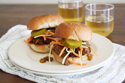Spoon 1/4-cupfuls of the meat mixture onto prepared dinner rolls. Top with a small handful of cabbage slaw and a couple bread and butter pickles, if desired. Serve immediately.