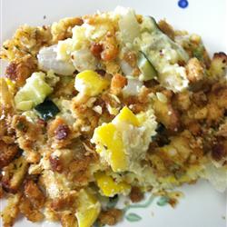 Spread the squash mixture into a medium baking dish. Mix together stuffing and 1/2 cup melted butter, and sprinkle over the squash mixture.