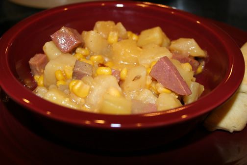 In 4-quart slow cooker, combine potatoes, ham, corn, and onion; mix well. In small bowl, combine soup, milk and flour; beat with wire whisk until smooth. Pour soup mixture over potato mixture; stir gently to mix. Cover; cook on low setting for 7-9 hours or until potatoes are tender.