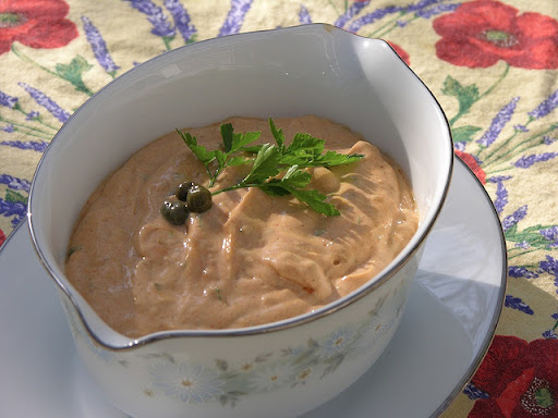 For the rémoulade sauce, put the mayonnaise, capers, pickle relish, tarragon, shallot, vinegar, garlic, mustard, salt, and paprika into a blender. Pulse several times, until well combined.