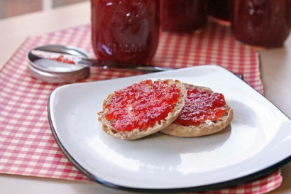 Remove pot from heat and ladle the mixture into the warm, sterilized jars, leaving about 1/2″ head space. Place lids on the jars and screw on the rings until just past finger-tight. Process in a boiling water bath for 10 minutes.