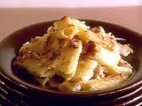 In a large pot, bring to a boil 6 quarts of salted water. Add the rigatoni and cook for about 5 minutes. Since you will be cooking the pasta a second time in the oven, you want to make sure the inside is still hard. Drain in a colander. Return pasta to the pot and pour in bechamel sauce. Using a wooden spoon, mix well until all the pasta is coated with the sauce.