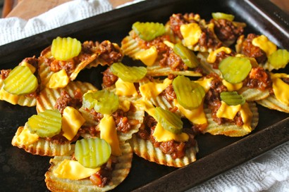 In a single layer, place the potato chips on a baking sheet. Spoon a generous amount of hot Sloppy Joes on each chip. Top with cheese and a pickle on each chip.