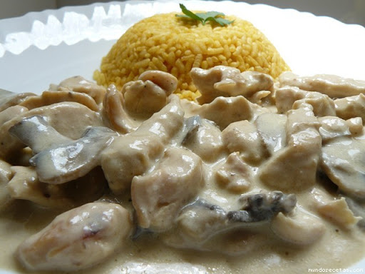 En una cacerola limpia colocaremos el pollo, las cebollas y los champiñones. Ponemos la salsa por encima y servimos enseguida.