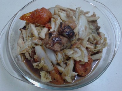 Then the tomatoes and cabbage go in. Add the cabbage stems first and let them soften and wilt for a few minutes before adding the leaves. Once the tomatoes and cabbage are softened, toss in sea asparagus (or mushroom) and simmer for only 1 minute. Turn off the heat and add miso paste. Make sure miso paste dissolves in the liquids.