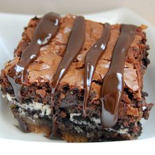 Next, prepare brownie mixes according to package directions. Mix in hot fudge sauce. Pour brownie batter over the cookie dough and Oreos, and spread evenly. Bake for 45 minutes. Let brownies cool completely before cutting. Serve with additional hot fudge topping if desired.