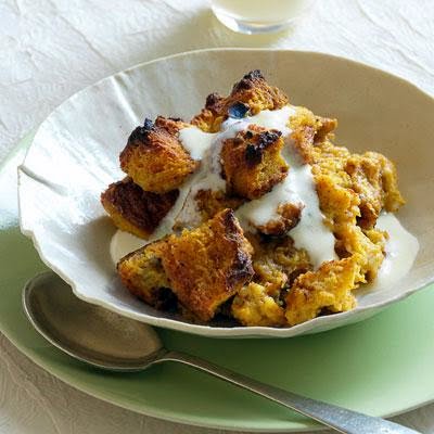 Challah pumpkin bread pudding is even more decadent when accompanied by a vanilla-rum custard sauce.