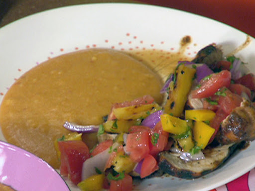 Chop and combine the tomatoes, bell pepper, onions and grilled pineapple spears.