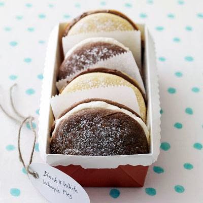 Traditional whoopie pies have creamy, white filling sandwiched between two chocolate cookies. This recipe pairs the typical whoopie pie with its opposite: white cookies and chocolate filling.