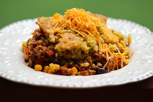 In a large skillet, add ground turkey and cook over medium heat, while breaking up turkey into small pieces. Cook turkey until no longer pink, about 10 minutes. Drain any fat and add turkey to the slow cooker. Add the remaining ingredients (except cornbread topping), stir well.