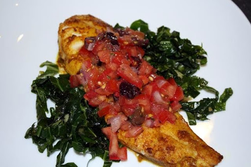 A delicious and healthy meal that is easy to prepare. The tomato and olive salsa adds freshness to the dish. It is shown above with sautéed collard greens. You can use your favorite white fish for this dish.