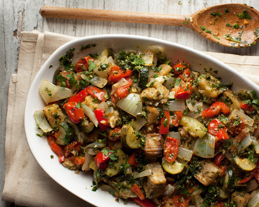 In a large bowl combine the onion, eggplant, zucchini, bell pepper, tomatoes, and garlic. Sprinkle on the thyme, marjoram, and oregano and season generously with salt and pepper to taste. Drizzle on the oil and toss to combine. Spread the vegetable mixture into a large baking pan. Roast until the vegetables are tender, about 45 minutes, turning once or twice to cook evenly. To serve, transfer to a serving bowl, add the pistou and parsley and toss to combine. Serve hot.
